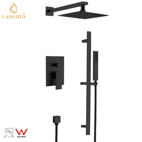 ระบบฝักบัวอาบน้ำแบบสายฝนติดผนังทองเหลืองพร้อมชุดฝักบัวแบบด้ามจับสีดำได้รับการรับรองจากลายน้ำ